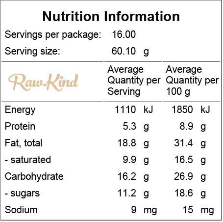 Cashews, coconut, dates, cooked kumara, raw organic cacao, coconut nectar, coconut oil, sea salt. Contains tree nuts. May contain traces of gluten, peanuts, milk products, soy and sesame.